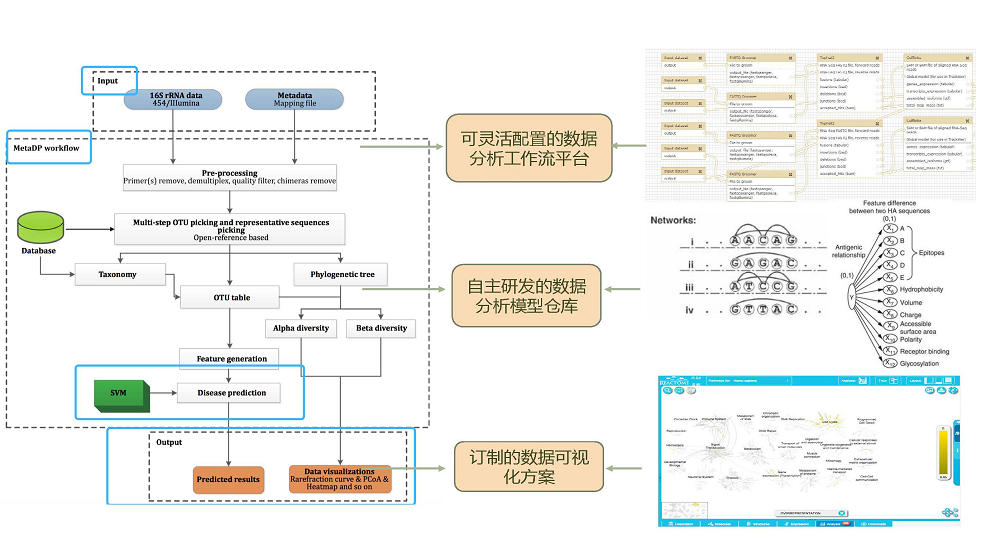 微生物信息化平臺基于生物信息學(xué)、多組學(xué)整合、人工智能等多項(xiàng)技術(shù)的綜合運(yùn)用,研發(fā)出一系列原創(chuàng)性算法,以實(shí)現(xiàn)對生命組學(xué)數(shù)據(jù)的深度挖掘;并通過將BI與IT技術(shù)進(jìn)行整合,構(gòu)建了從數(shù)據(jù)整合、數(shù)據(jù)管理、工具訂制到數(shù)據(jù)可視化的高通量測序數(shù)據(jù)分析平臺,可實(shí)現(xiàn)數(shù)據(jù)分析和科研及臨床醫(yī)學(xué)的深度融合。